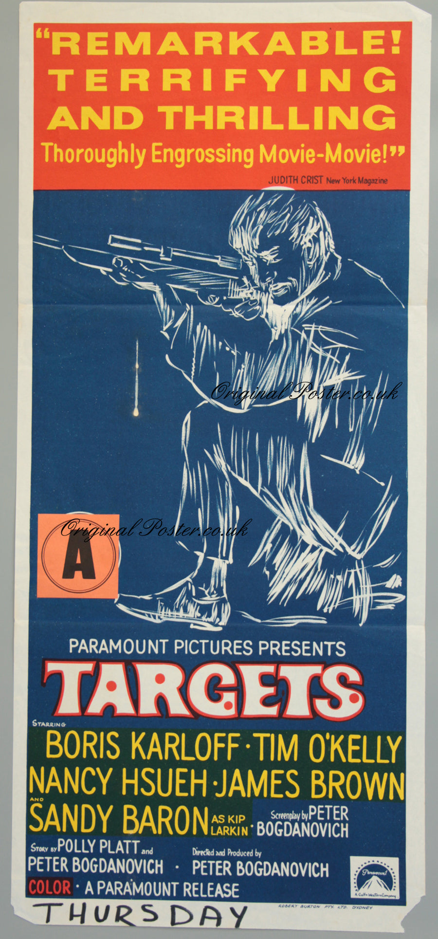 The American problem - random killing sprees by individual nutcases. This film made in 1968 is based on the real life killing spree of Charles Whitman in 1966. The film poster from that year advertises the brilliant feature debit of the film critic turned writer and director Peter Bogdanovich and stars the amazing Boris Karloff as an ageing horror star who finds himself the target of a gunman in America - even back then - the terrible reality of the random sniper. Great that we have this Robert Burton printed film poster to remind us of the problems we still have yet to solve. Horizontal folds and a corner tip missing at the bottom right plus a show date felted at the bottom.
