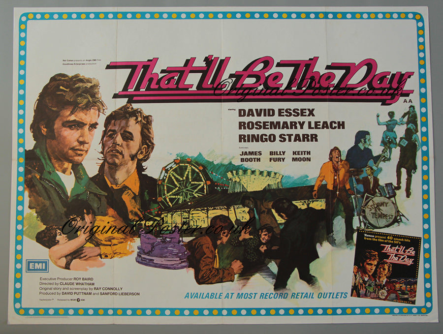 This 1973 British quad film poster features great Arnaldo Putzu artwork of life in the fairgrounds and the rigours of rock and roll touring. The artwork features really great likenesses of Ringo Starr with David Essex and Rosemary Leach. Also featured is a plug for the LP record soundtrack TV advertised by Ronco. Printed in England by W. E. Berry ltd. Bradford. This poster is in folded condition as issued to the cinemas and no pinholes plus a biro written title to reverse which does not show through.