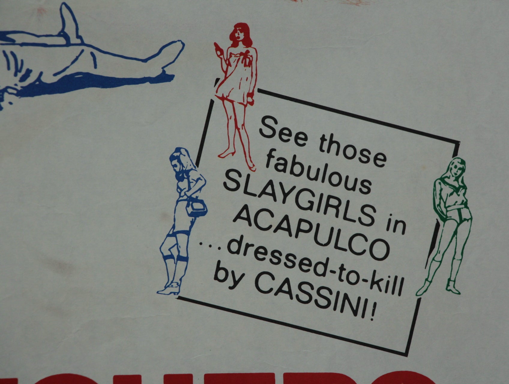 This amazing original British quad film poster dates from 1967 and was printed in England by Lonsdale & Bartholomew of Nottingham. It has just one vertical fold line and the most immaculate show time details! Very few British quads feature a flying saucer on the artwork, painted here by artist Robert McGinnis, and here we have one plus five beautiful girls and Dean Martin as Secret Agent Matt Helm. The artwork really is first class and this even extends to a detailed sequence on the Audie Murphy support film "40 Guns to Apache Pass." There is also a fashion advert "See those fabulous SLAYGIRLS in ACAPULCO ...dressed-to-kill by CASSINI".