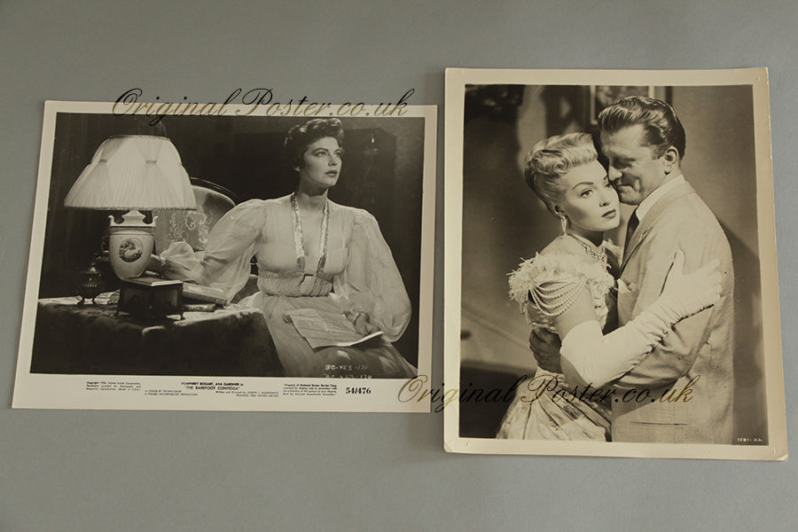 A black and white cinema still from 1952 picturing Kirk Douglas with Lana Turner in the film "The Bad and the Beautiful" plus a UK FOH still for "The Barefoot Contessa" picturing Ava Gardner.