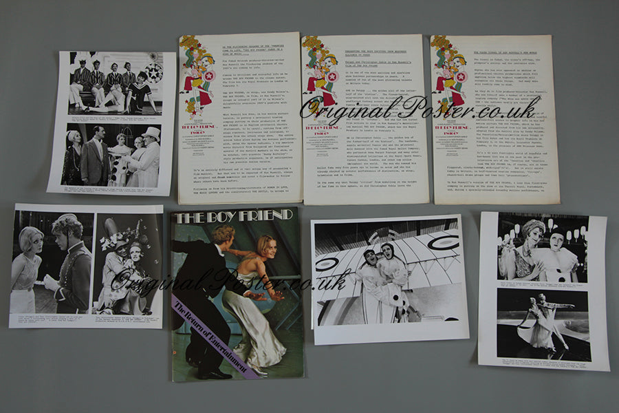 26 page souvenir booklet for "The Boy Friend" produced for cinema goers in 1971 for the release at the cinemas of the Ken Russell directed film starring Twiggy. Also included are four front of house cinema lobby cards with photos from the film and descriptions of each underneath. The Bi-plane photo has an attachment to the reverse of the EMI MGM cast. Also included are three 2 page colour attachments detailing "Twenties come to life", "the faded tinsel" and "Exciting showbiz alliance" produced by the MGM EMI publicity department in London dated 71 72.