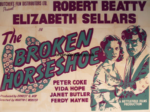 This 1953 two colour silk-screen British quad features Robert Beatty wearing a most unusual peony floral sleeved jacket. A shame the printers didn't run to more colours but then this film was made in black and white after all. Lucky horseshoe pictured! A Butchers film