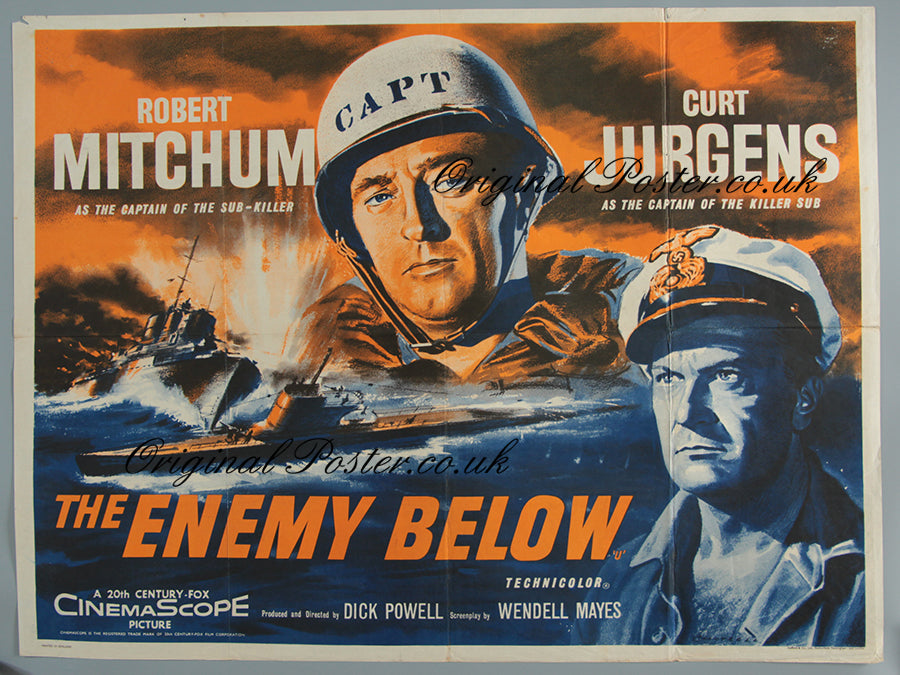 Terrific 1957 first release British quad film poster for the Dick Powell directed "The Enemy Below" and featuring artwork by the great British artist Tom Chantrell whose printed signature appears at the foot of the portrait of Curt Jurgens, the Captain of the German U-boat. The central image is of the Captain of the US Destroyer Robert Mitchum whose ship can be seen ramming the U-boat with devastating effect. Superb 20th Century Fox CinemaScope film poster with great colour printing by Stafford & Co. of Netherfield, Nottingham and London. Multiple pinholes at the top right and left corners.