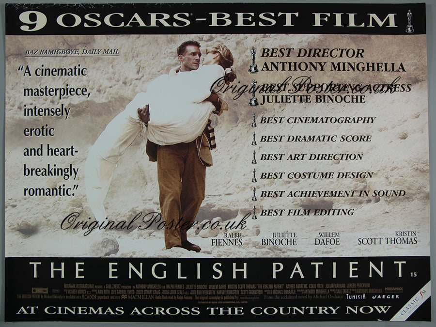Rolled condition double-sided film poster for the 1996 Second World War romantic drama "The English Patient" printed in limited numbers for use in the cinema light box. The poster proudly displays the 9 Oscars for this well regarded 2nd World War film. Edge wear at the top left border as seen.