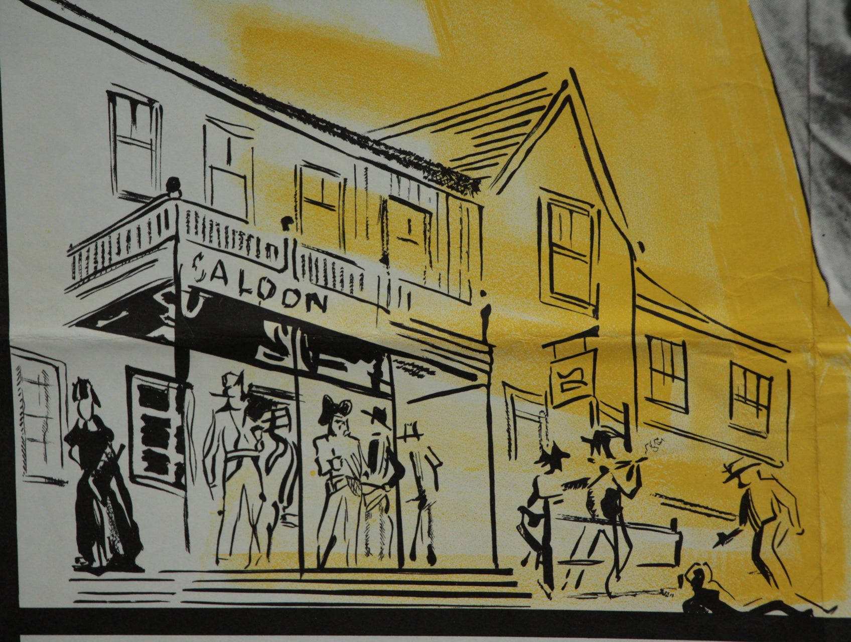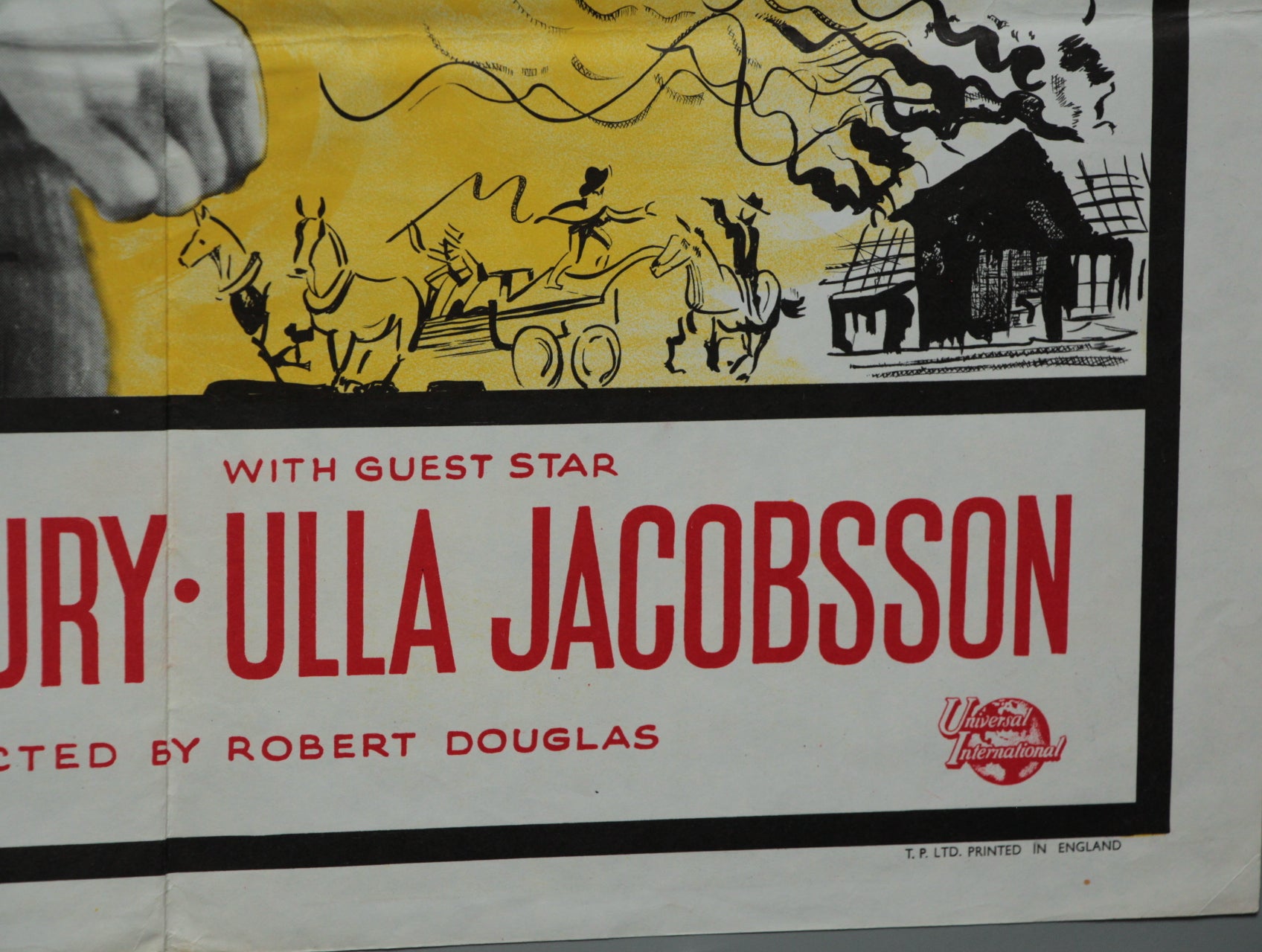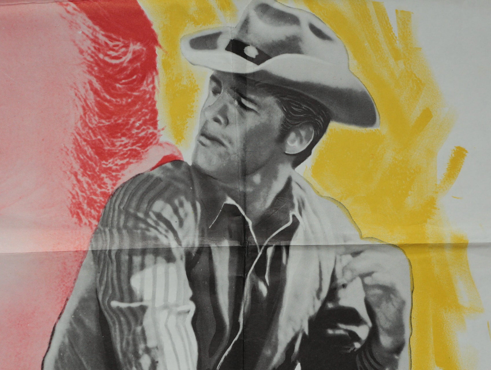 This British quad film poster is a fine example of how American artwork is used but modified to suit the British market and the horizontal layout of the poster. Although shown at the cinema (This one is from Drapers Town Cinema) The content is from the TV series "The Virginian" which was very popular on the telly in the UK. The photos of the popular stars are complemented with the saloon and cowboy cartoon sketches. A little sellotape at top left and right border, pinholes in the top corners Printed by T.P. Ltd.