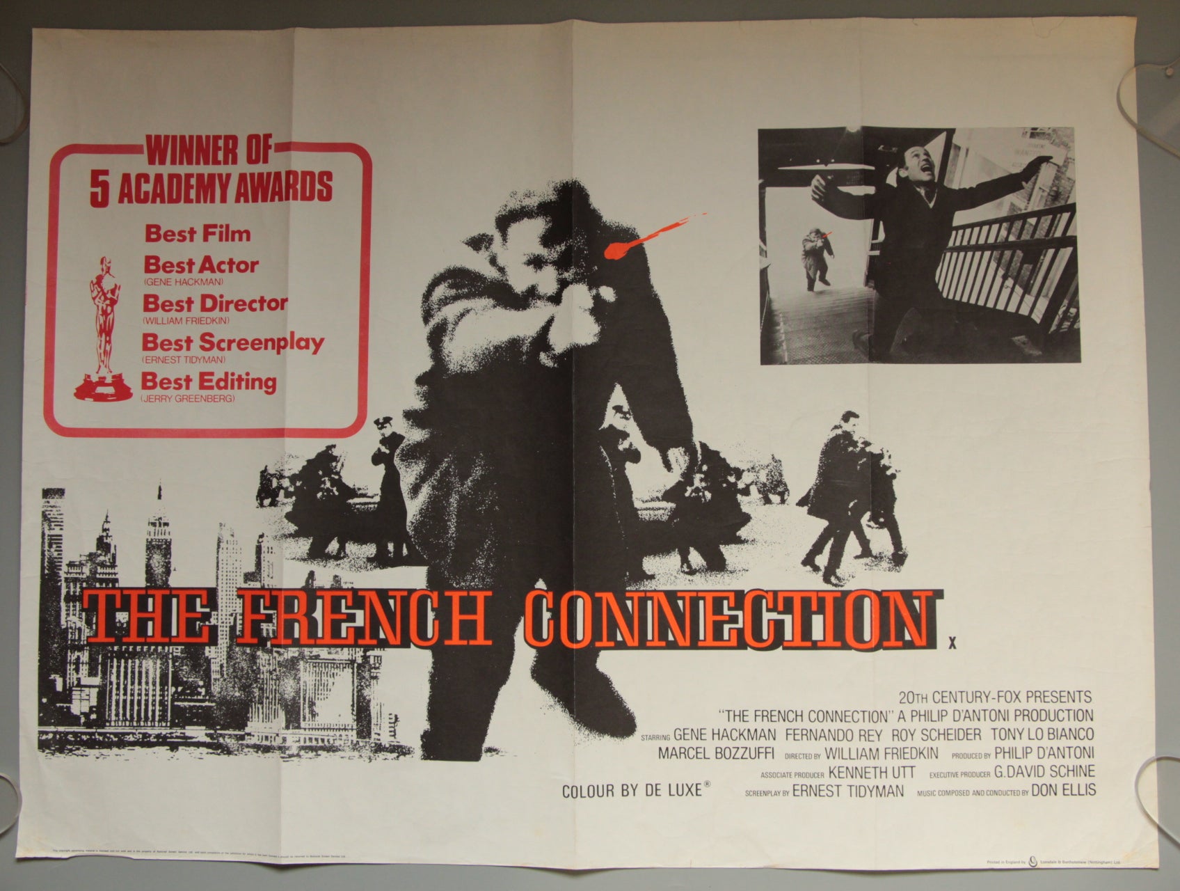 This is the original British quad film poster from the year 1971 for the classic crime film "The French Connection" which is based on a real life drugs bust by the New York narcotics cops. Directed William Friedkin employs a documentary style in which Gene Hackman wins an Oscar for his role as the no nonsense detective "Popeye" Doyle. Printed in England by Lonsdale & Bartholomew of Nottingham. The poster features the "X" certificate together with photos of Gene Hackman as Jimmy "Popeye" Doyle together with the New York landscape. The film poster has a good clean look with just three vertical fold lines and some minor creasing as seen.