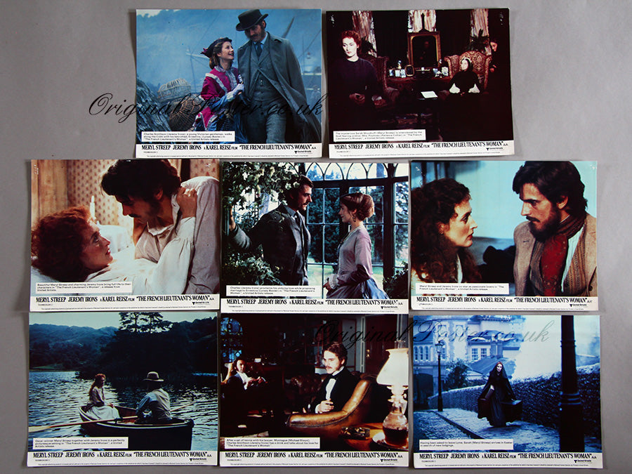 Full set of eight British cinema lobby cards for the film "The French Lieutenant's Woman" starring Meryl Streep and Jeremy Irons. Please note these cards have a few pinholes in the corners from when they were displayed at the Astor cinema, Devon.