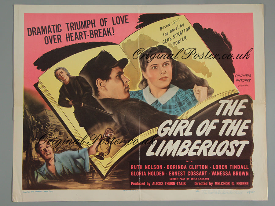 "The Girl of the LimberLost " was a war-time film depicting the difficulties of the time. Based on the novel by Gene Stratton Porter and the book is featured on this 1945 film poster together with full colour artwork of the stars in action. Litho printed folded poster with no pinholes and a green stamp to the reverse. Pictured are scenes from the film in full colour with a tribute to the novel.