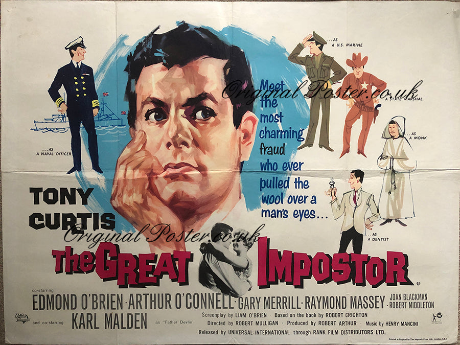 Music by Henry Mancini with full colour Renato Fratini painted portrait of Tony Curtis in this first release British Quad for the Robert Crichton written "The Great Imposter" from 1960.