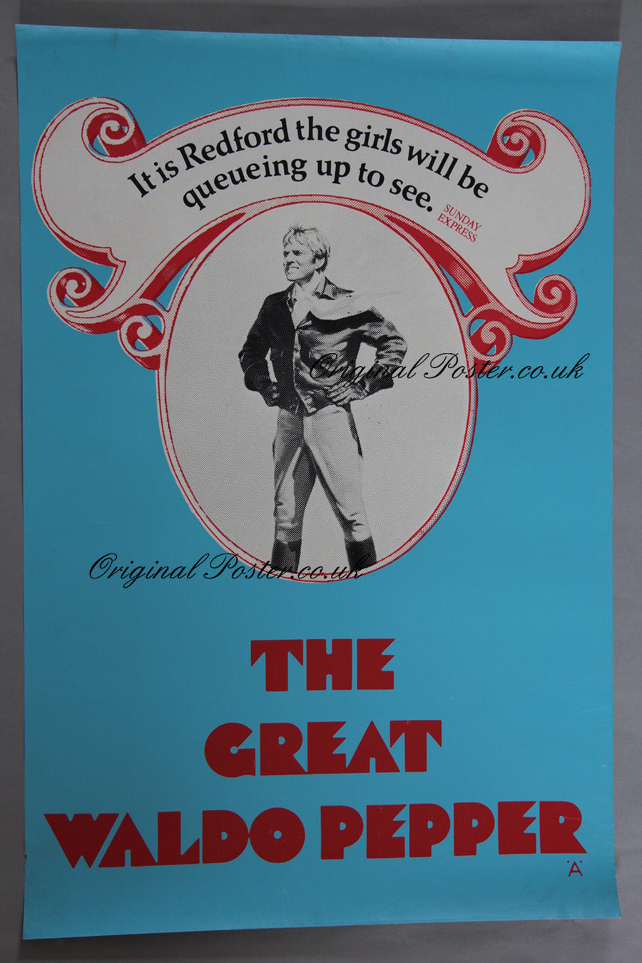 Robert Redford is the centre of attention dressed in flying gear as the former first world war pilot in the film "The Great Waldo Pepper". The Sunday Express review reads "It is Redford the girls will be queuing up to see." Excellent rolled condition double-crown teaser film poster from 1975.