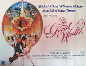 The story of Strauss in wonderful colour with Bob Peak the artists printed signature appearing on the film poster from 1972. Highly detailed painted artwork of period dancers dancing the Waltz in the ballrooms of Vienna. Together with mountain scenes and folk dancers by the great American artist Bob Peak whose printed signature appears at the lower left of the artwork. Horst Bucholz plays Johann Strauss and there is an on screen appearance by Mary Costa the singing voice on Walt Disney's Sleeping Beauty". This 1972 British quad film poster from MGM is in folded condition as issued to the cinema.