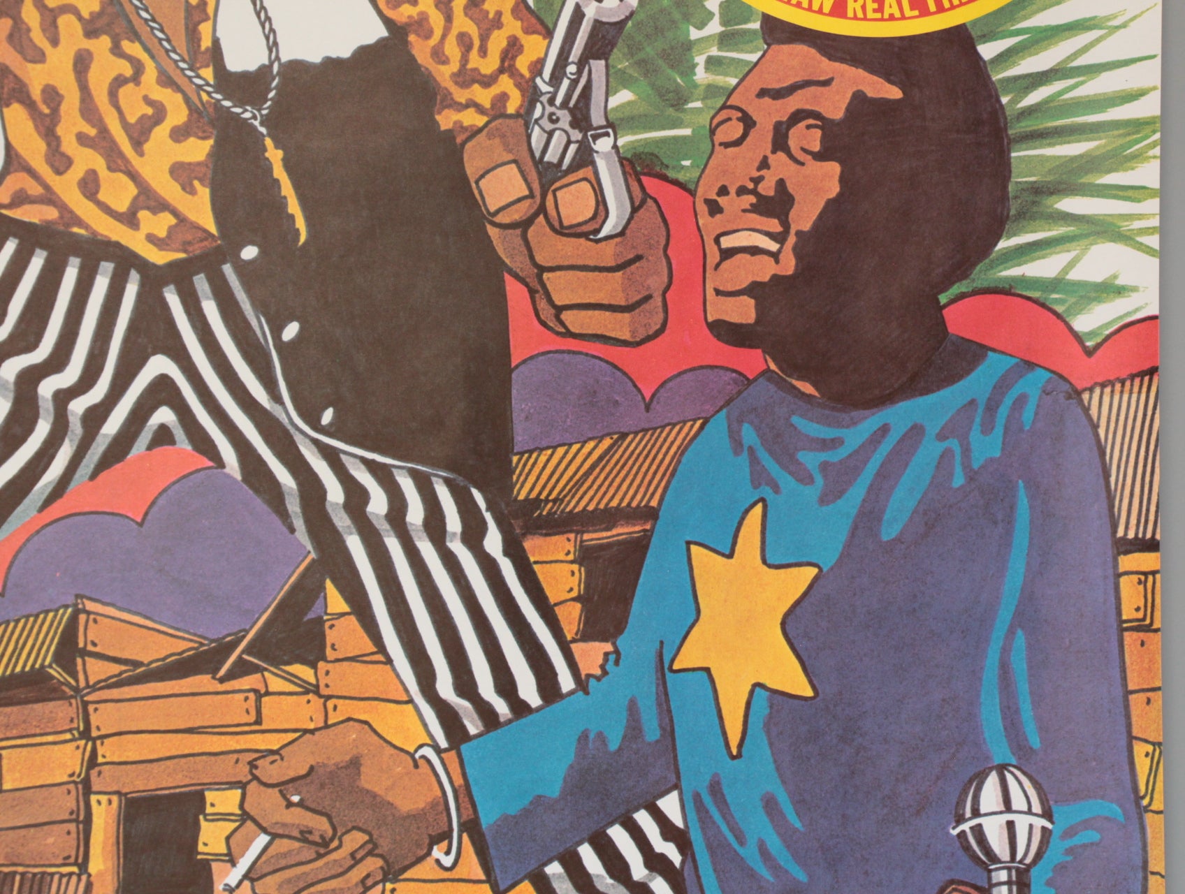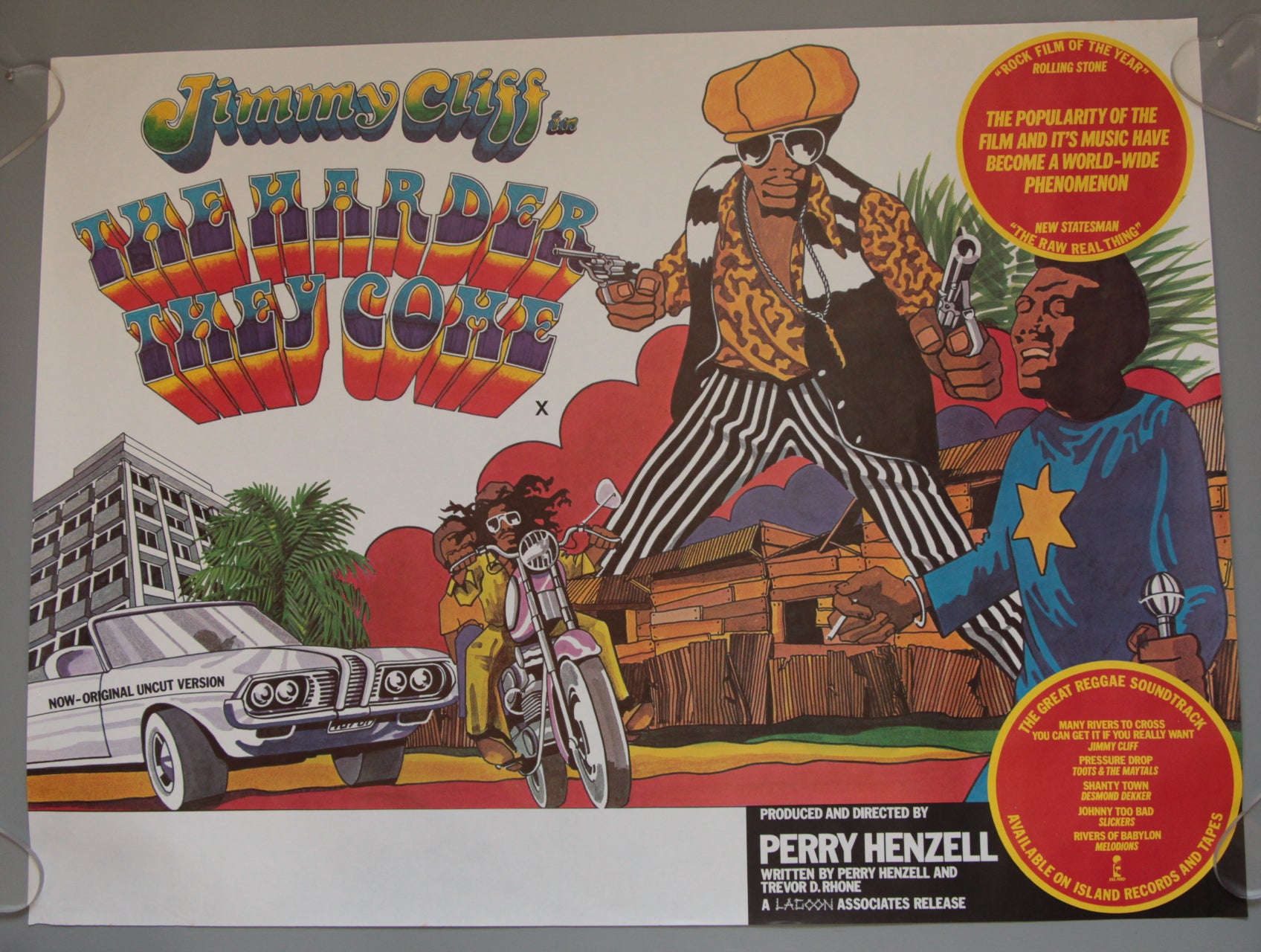 Filmed in Jamaica this cult 'X' certificate film really put reggae music on the map and was based largely on the life of Jimmy Cliff who became a massive star and sings "Many rivers to cross" and "You can get it if you really want". Brilliant hard-hitting colours depict the exotic and shanty town of Kingston. The film featured many local personalities speaking in Patwa. Incredible soundtrack includes "Shanty Town" by Desmond Dekker and "Pressure Drop" by Toots & the Maytals. Wonderful painting of Jamaican life with the late great Jimmy Cliff pictured at the right of the poster holding the mic and just above the advert for some great music including The Melodians. Excellent rolled condition film poster with no pinholes and very bright colours.