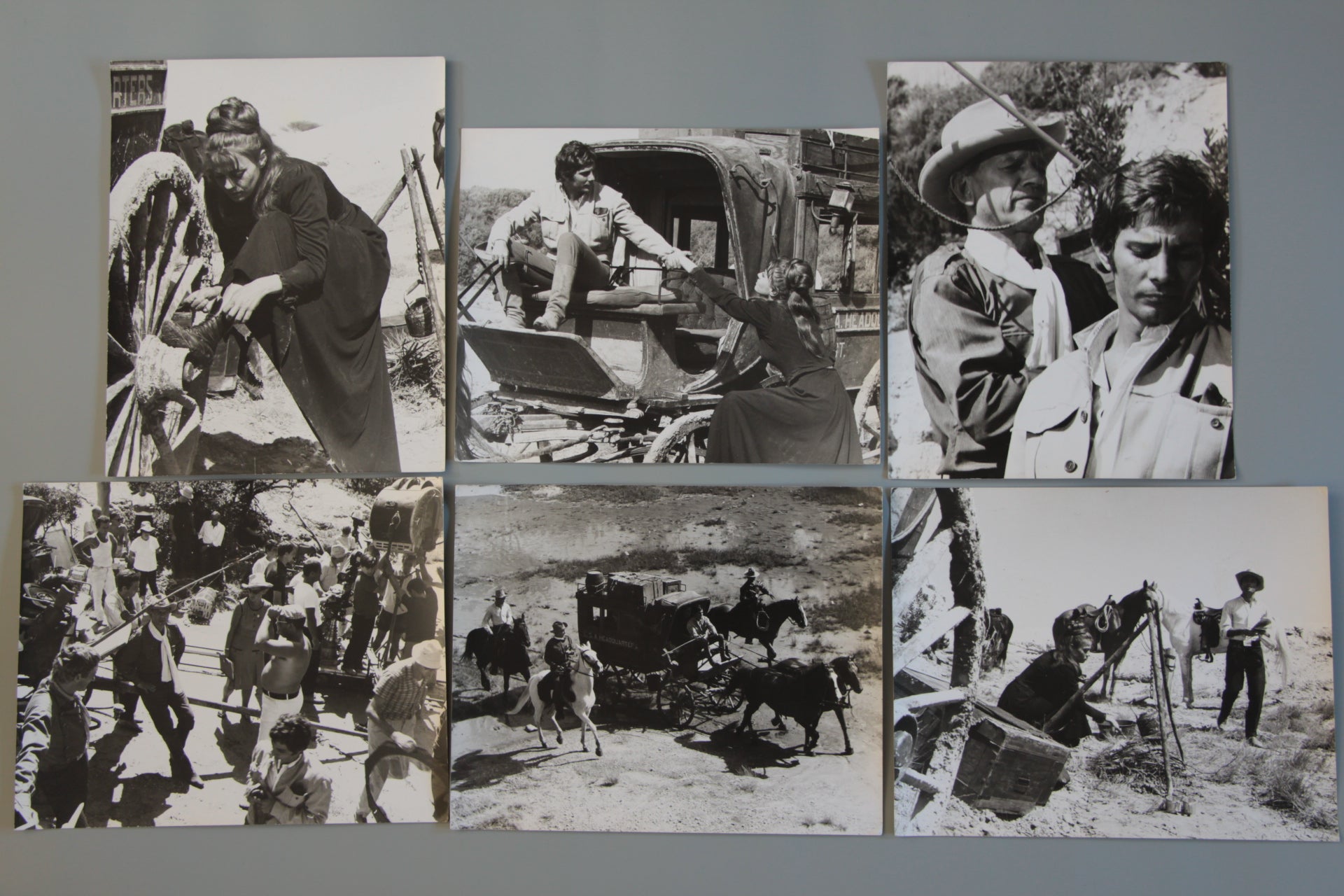 Six super country of origin Italian stills for the 1967 spaghetti Western film directed by Sergio Corbucci. "The Hellbenders" Delightful purple stamp to the reverse "photographs by Angelo Pennoni - Roma". Ennio Morricone provided the music with these large stills picturing the coffin full of civil war loot, the drunken prostitute kitty pretending to be the Officers widow, Clare the saloon hostess and professional gambler and also a fantastic behind the scenes photo picturing the lighting set up and actors relaxing before the next shot.