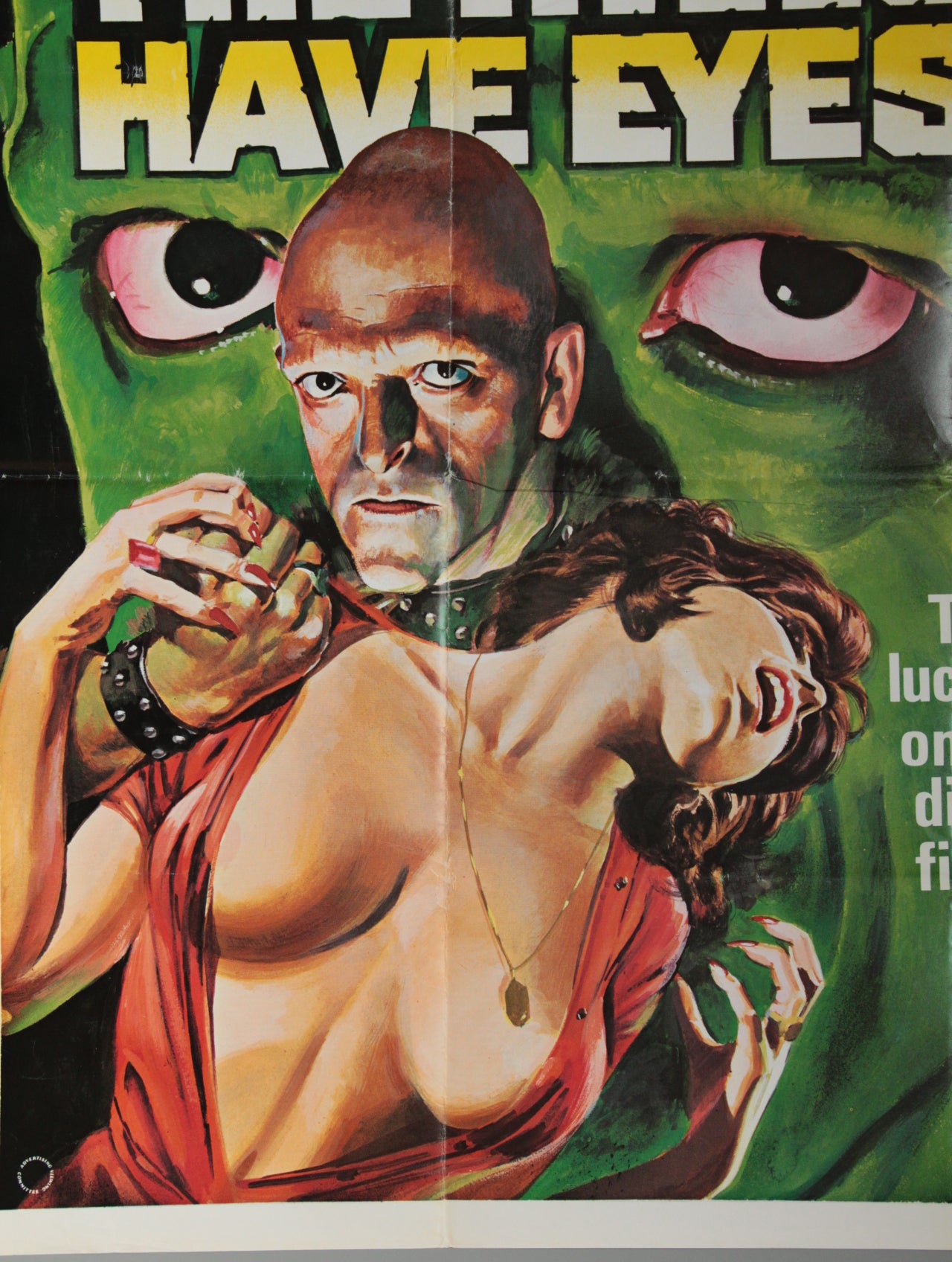 Great original art style painted by British artist Tom Chantrell for this cult 'X' certificate horror film "The Hills Have Eyes". Fingers were crossed on this one as to the censor's reaction which turned out to be favourable. Alternative artwork was waiting in the wings just in case! This X certificate double-bill film poster dates from 1978 and is in folded condition , printed in England by Broomhead Litho. Ltd. with no pinholes but a small drawing pin head size hole at the left cross fold.