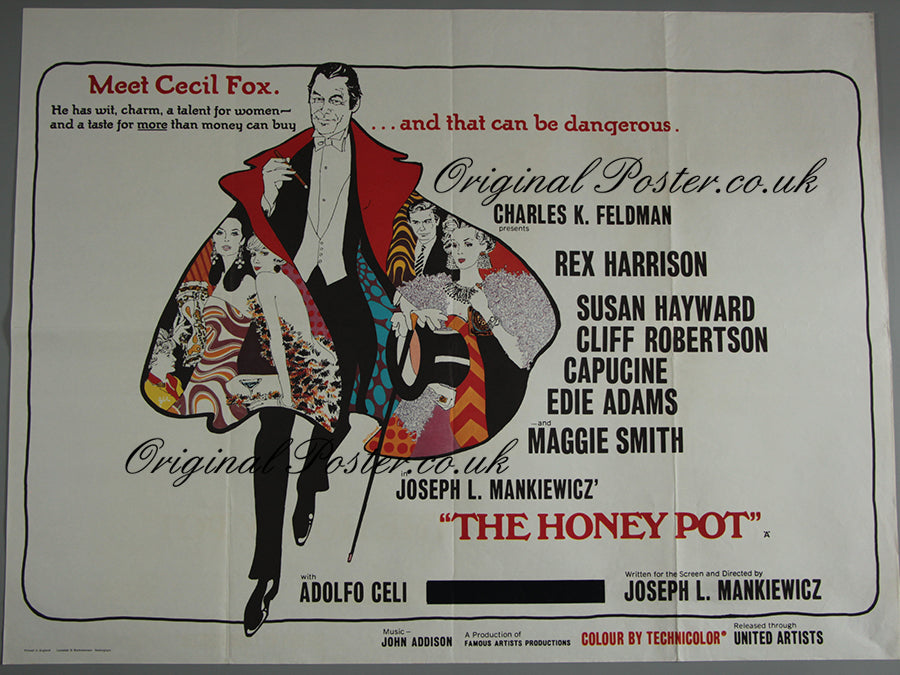 Delightful 1967 psychedelic artwork proving a real eye-catcher with incredible detail. Determined not to be overlooked if one looks carefully in the bubbles of the champagne glass the artists name is revealed for the second time. This is relevant as some film companies would crop the artists name so they did not become too famous and could be relied on to be hungry for more work! Folded film poster printed in England by Lonsdale & Bartholomew Nottingham.