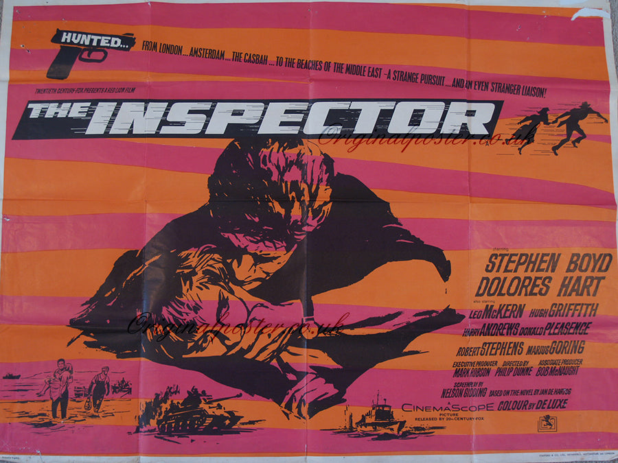 This British film poster from 1962 pictures Stephen Boyd as the Dutch Police Inspector with Dolores Hart as the Jewish girl who he saves from the Nazis. An impressive supporting cast includes Harry Andrews and Donald Pleasence. The film poster features the Red Lion film logo and the 20th Century Fox CinemaScope logo too. Unusual colourful design for an unusual story. Set as a hunted couple travel worldwide to escape their pursuers. Printed by Stafford & Co. of Netherfield, Nottingham & London. Many pinholes in corners and small paper-loss at top right.