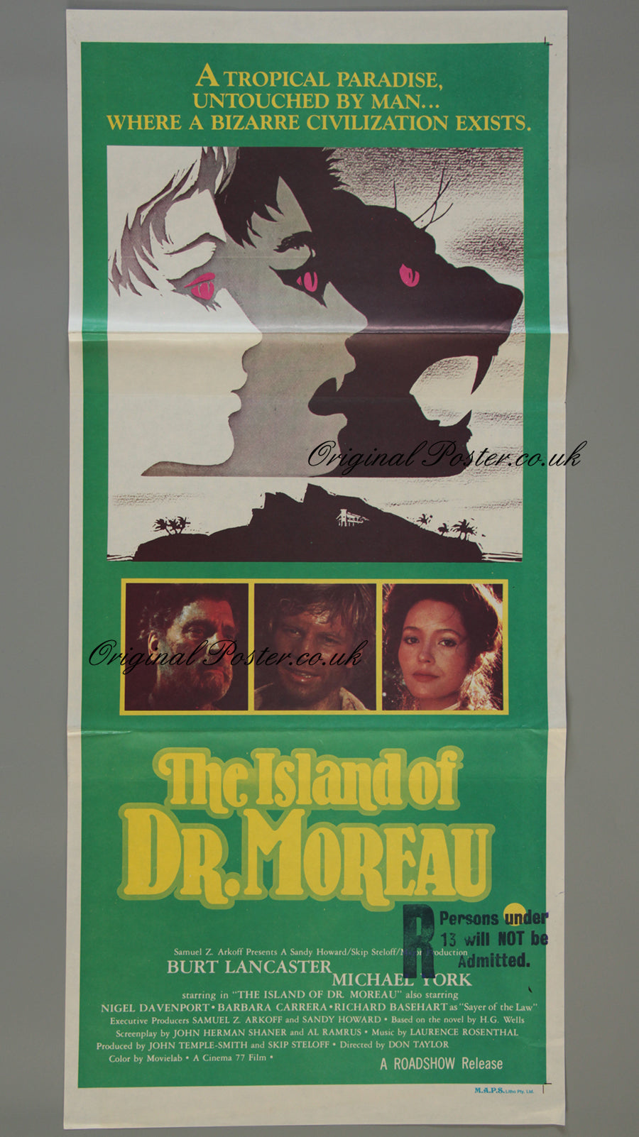 This 1977 film poster for "The Island of Dr. Moreau" pictures the results of genetic experiments and pictures the three stars Burt Lancaster, Michael York and Barbara Carrera. This litho printed film poster has no pinholes and features the New Zealand certificate stamp at the lower right.