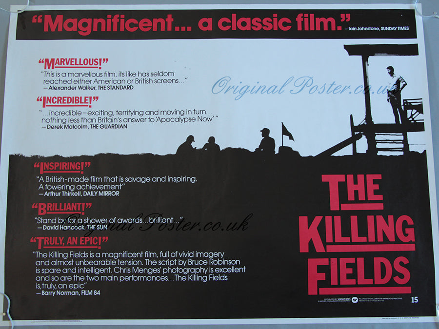 "The Killing Fields" rolled 1984 review style British quad film poster with six newspaper reviews for this biographical war drama directed by Roland Joffe, printed in England by W. E. Berry Ltd. Bradford.