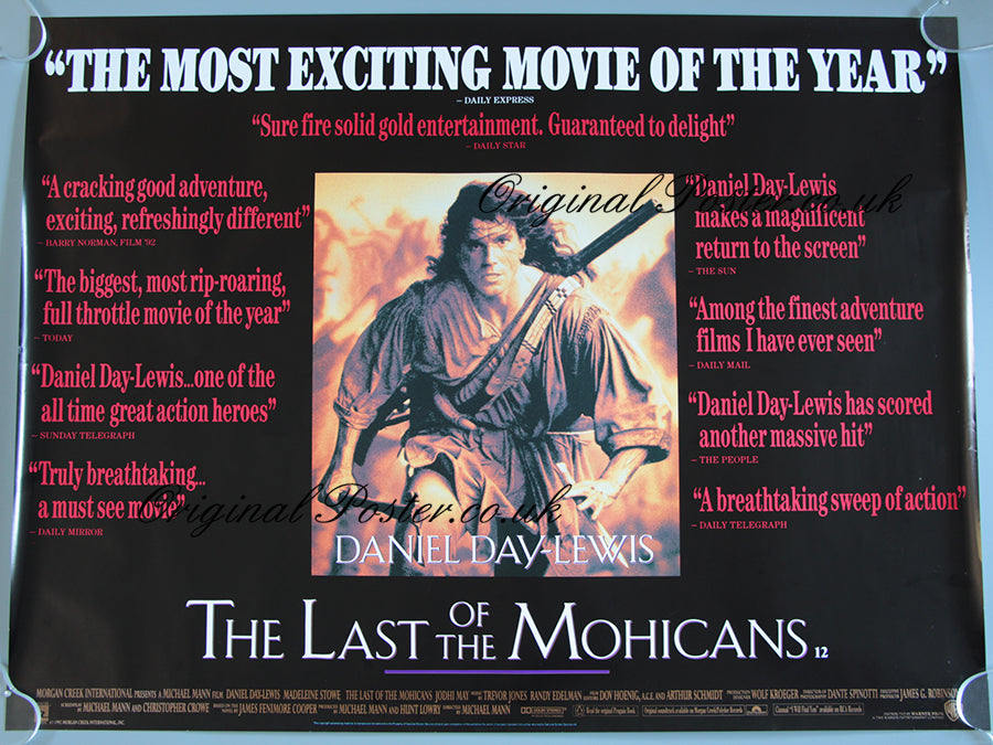 Review style British quad film poster for "The Last of the Mohicans" in rolled condition picturing Daniel Day-Lewis from 1992.