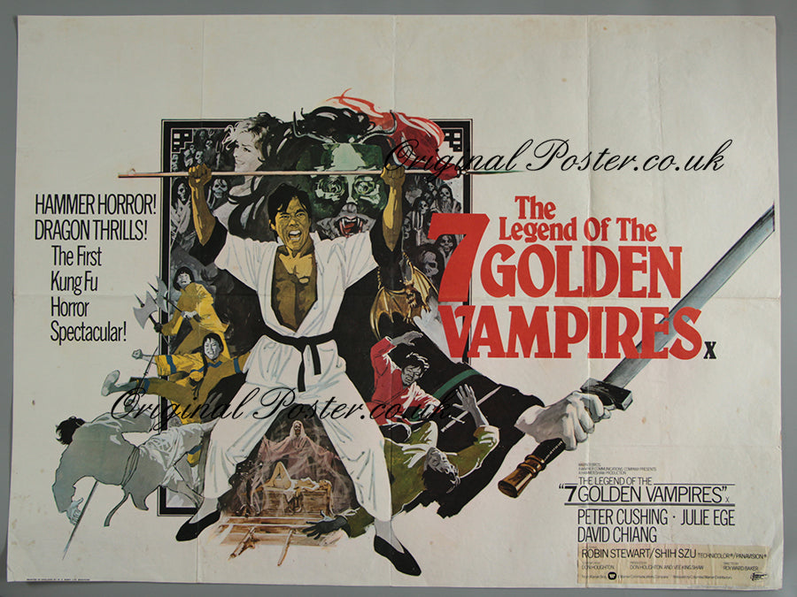 Popular Hammer vampire tale of Peter Cushing travelling to China as Van Helsing to confront Dracula this time aided by martial arts experts. While a Kung Fu Horror movie seems unlikely it works well. Superb artwork here. This 1974 first release British quad printed in England by W.E. Berry of Bradford includes a Warner Bros. printed amendment at the bottom right for the name "Robin Stewart" previously mis spelt as "Stuart". The poster has some marks as seen in the white areas and a small area of paper infill on David Chang's spear together with two small areas of conservation tape to the reverse.