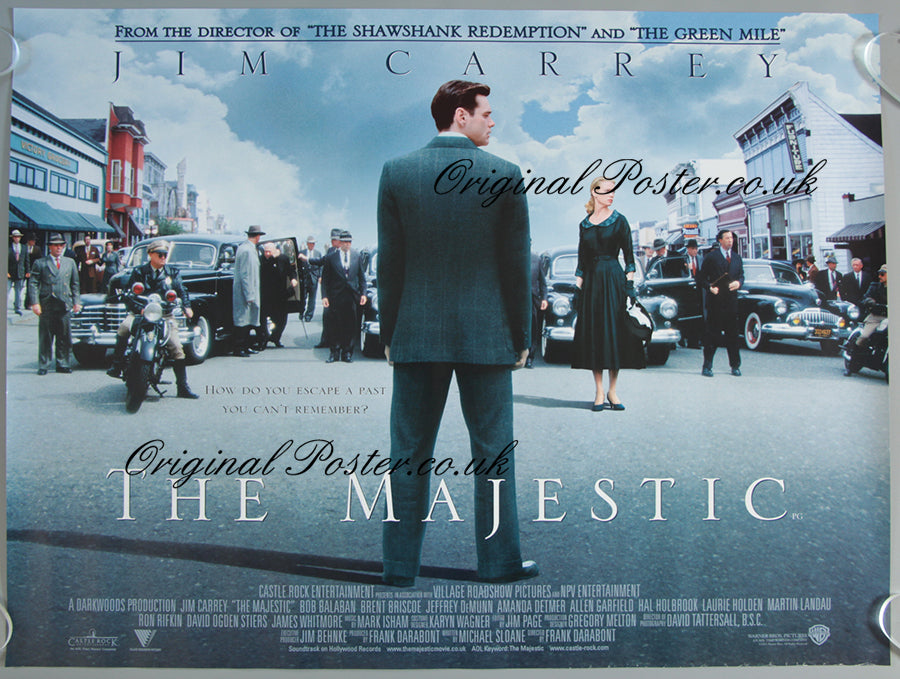 Set in 1950's America Jim Carrey is a black listed Hollywood screenwriter who while drunk and really sad drives his car off a bridge and then suffers from amnesia. Martin Landau has lost his missing soldier son and Carrey has a remarkable resemblance and is mistaken for the son. Martin Landau is the owner of the town's Majestic cinema and Jim Carrey helps the town in reviving the cinema. Great pictures of cars and fashions of the day in this feel good movie from a classy director Frank Darabont. Rolled condition film poster from the director of "The Shawshank Redemption" and "The Green Mile".