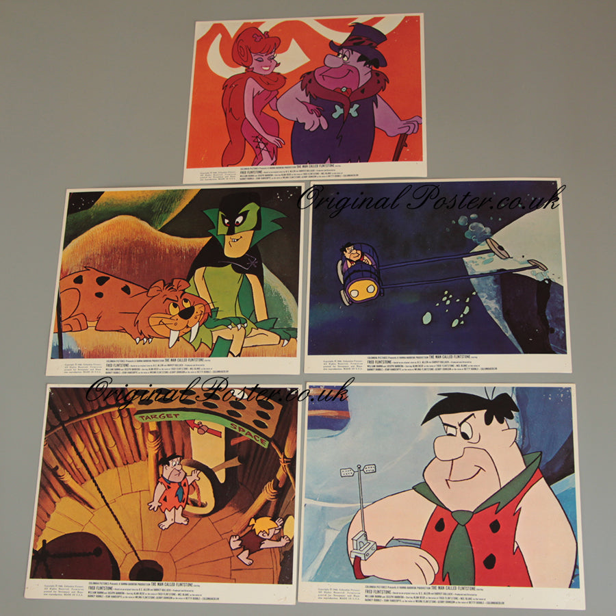 "The Man Called Flintstone" 5 original cinema lobby cards from the animation maestros; William Hanna and Joseph Barbera who brought us Top Cat, Scooby Doo and Tom and Jerry among others. These vividly coloured vintage 1966 lobby cards feature the every cave-man Fred Flintstone in his first cinematic adventure. Please note the cards have several pinholes in the corners from when they were displayed in a New Zealand cinema.