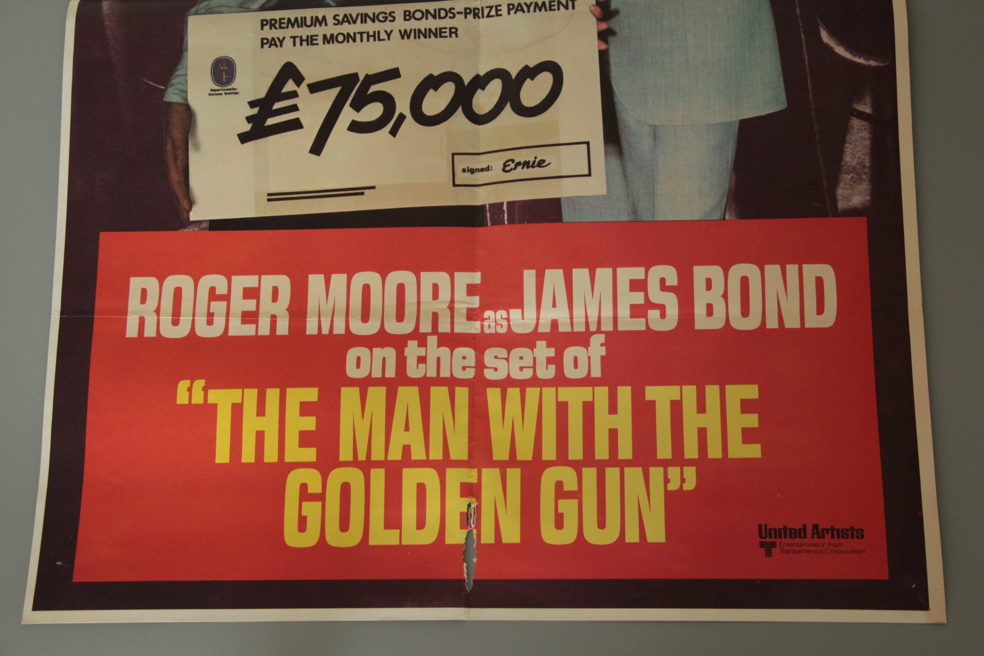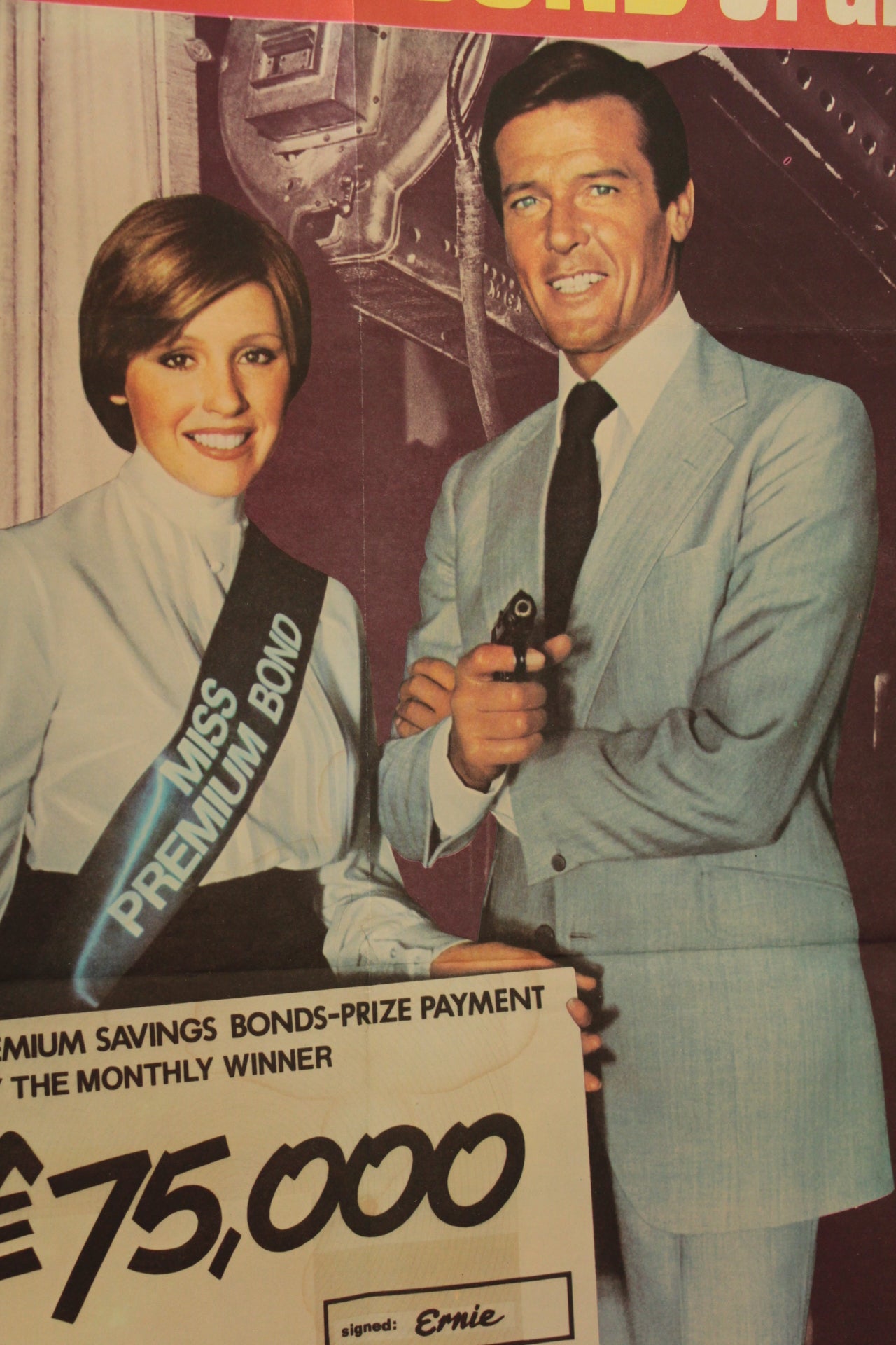 "The BIGGEST BOND of all!" "Roger Moore as James Bond on the set of 'The Man with the Golden Gun'" Roger Moore provides the security for the glamorous "Miss Premium Bond" as she reveals the premium bonds cheque signed by "Ernie" who is of course the computer responsible for drawing the numbers. A great piece of cross promotion and a humorous one too! This folded double crown film poster has a small section of historic water damage at the centre of the poster plus a little paper-loss at the bottom centre fold line as seen. It is a rare promotional poster linking James Bond to Premium Bonds and a rare smaller size printed in limited quantities.