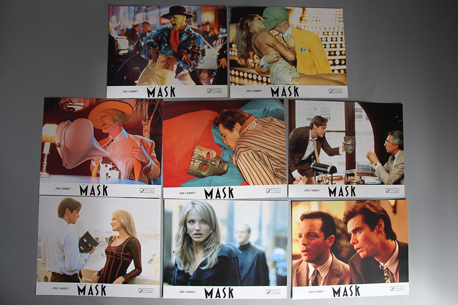 Jim Carrey is a run-of-the-mill banker who finds a magical ancient mask which turns him into a crazy wild super hero. This full set of colour front of house cinema lobby cards as issue to the cinema in 1994 feature pictures including the many different characters played by Jim Carrey and some great photos of his love interest Cameron Diaz. Great condition cards with no pinholes.