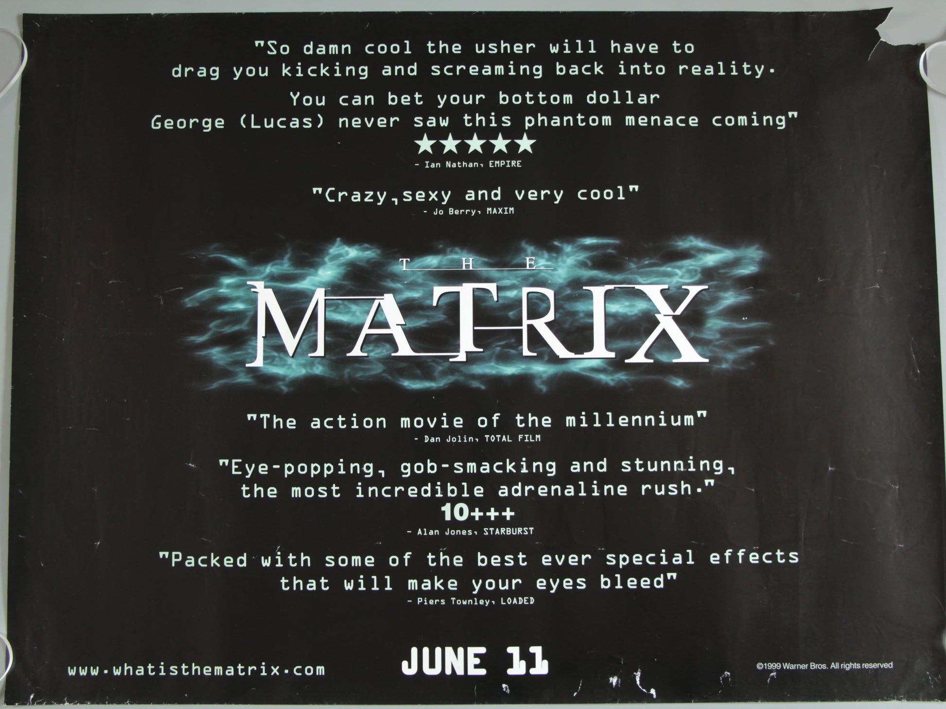 UK teaser rolled quad with reviews and two-dimensional logo. Corner missing at top right as seen, a few creases and a paper lift mark at the bottom on this original film poster from 1999.