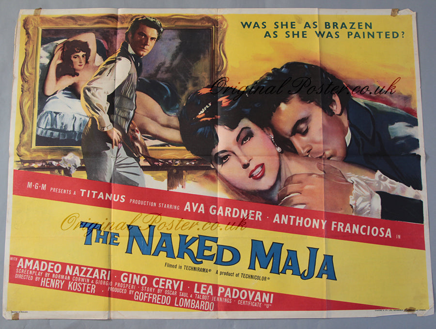 Ava Gardner is painted playing the part of the Duchess of Alba who was painted in a scandalous nude portrait by the Spanish painter Goya about whom this biography gives a revealing account. We can see the painting on this British quad film poster with actor Anthony Franciosa who plays Goya protecting the Duchess' modesty. He painted two versions of the painting - a later one complete with clothes. Printed in England by Stafford & Co of Netherfield Nottingham & London.