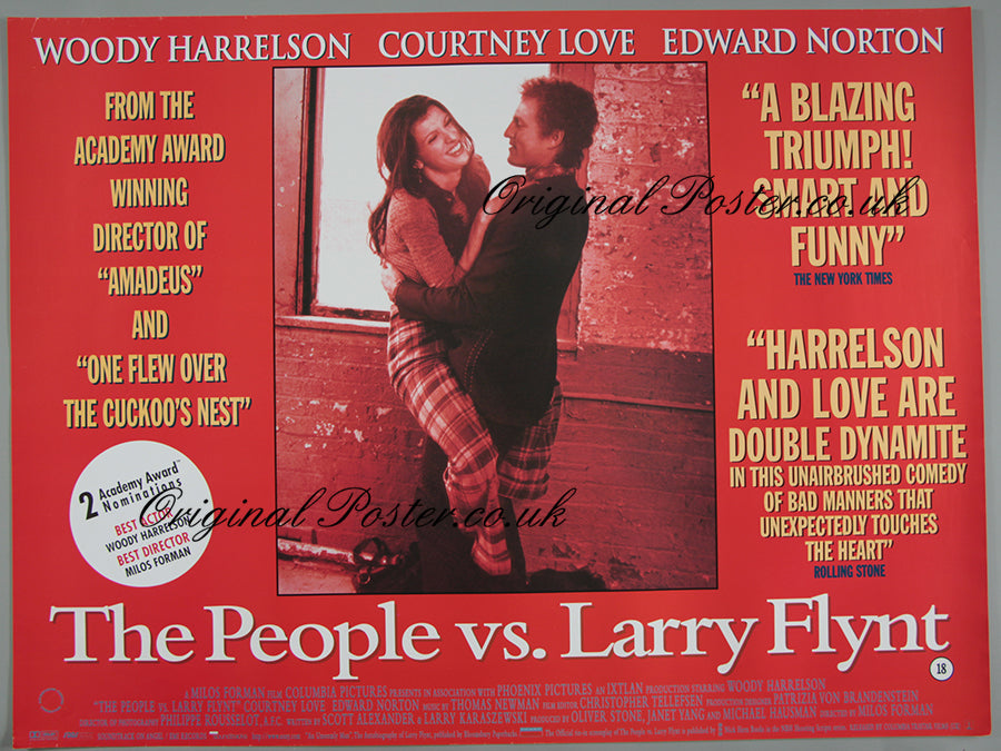 This is the 1996 double-sided rolled condition British quad film poster for "The People vs. Larry Flynt". Produced in limited quantities for use in the cinema light box. Director Milos Forman (One Flew Over the Cuckoo's Nest) offers a critically acclaimed biography here which earned an Oscar nomination for him and for Woody Harrelson in the role of Larry Flynt.
