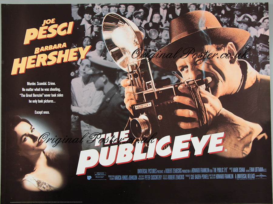This stunning 1992 rolled condition double-sided British film poster was produced in limited quantities for use in the cinema light box. Joe Pesci is pictured as the 1940's tabloid photographer and is using a Speed Graphic produced by Graflex in Rochester, New York. The photographer has dreams of being recognised as an artist and wealthy widow Barbara Hershey offers to help his dream by publishing a book of his photographs in return for information. He then finds he is sucked into a world of warring between rival mob families. This stunning film poster from a film made in colour and black and white has moody lighting and a great film noir style. A real treat.