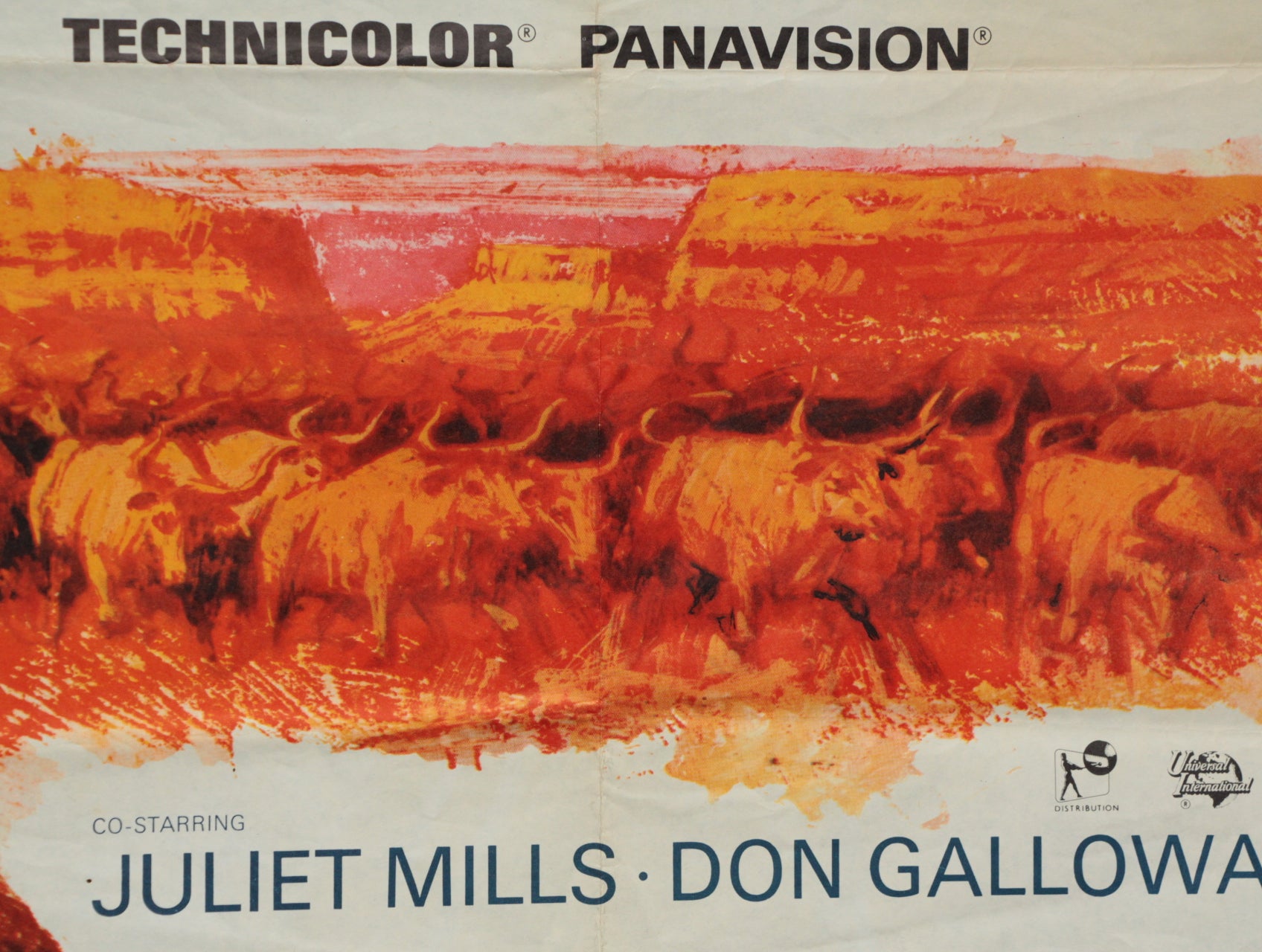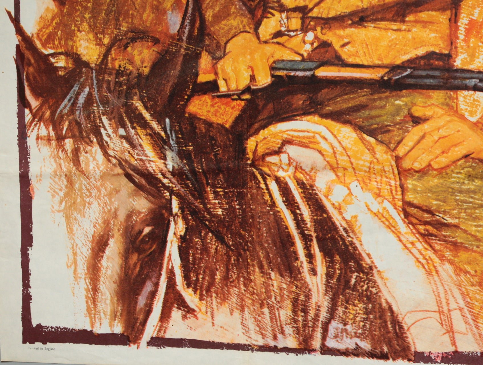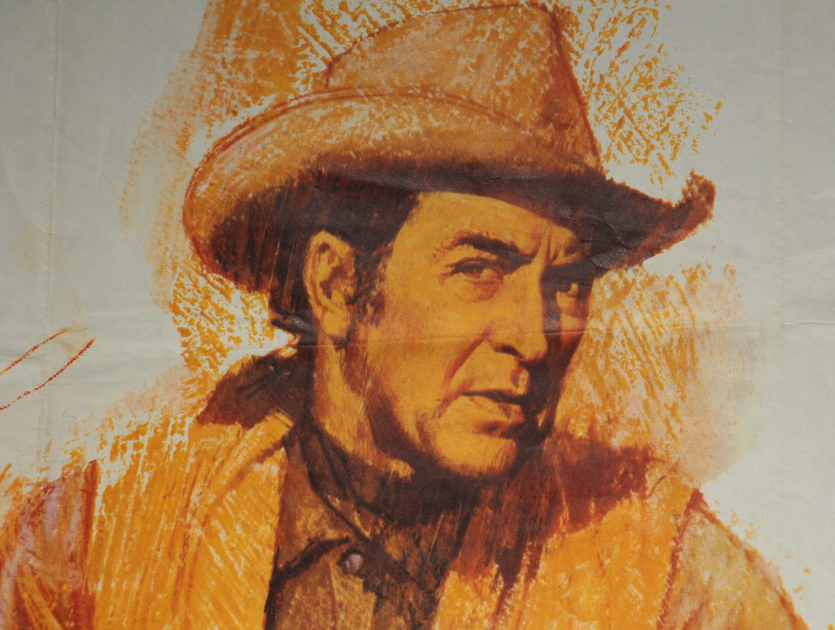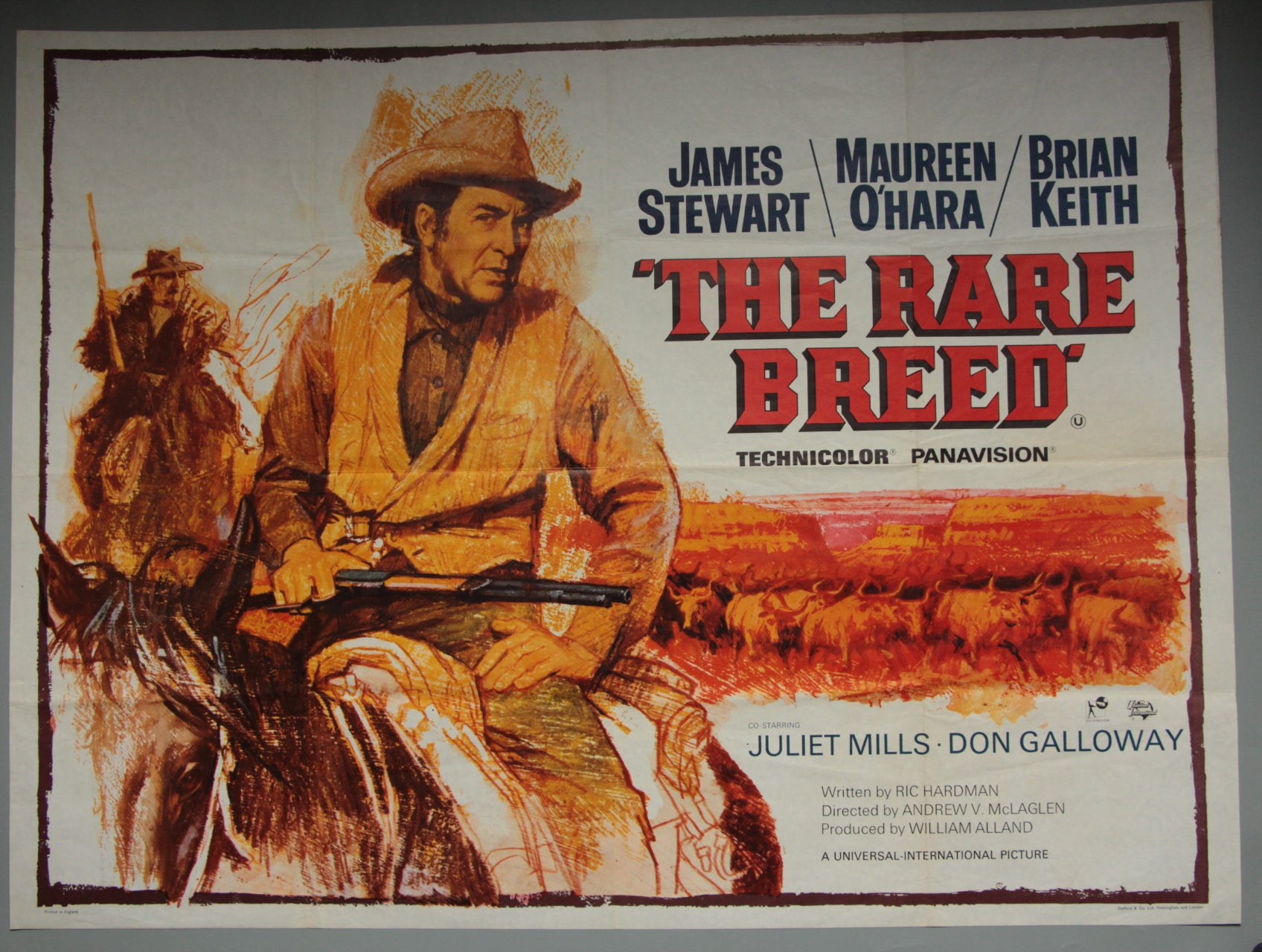James Stewart plays the lovable drifter. Maureen O'Hara the feisty widow who imports a prize Hereford bull and Brian Keith the rough cattle baron. The artist has employed a rare technique and has captured James Stewart with his look superbly in this colourful and atmospheric film poster for "The rare Breed". The film poster dates from 1966 with printing by Stafford & Co. of Nottingham and London and is in very good folded condition with the title written on reverse in blue biro at the lower left which does not show through to the front. Great colours. Folded condition with no pinholes.