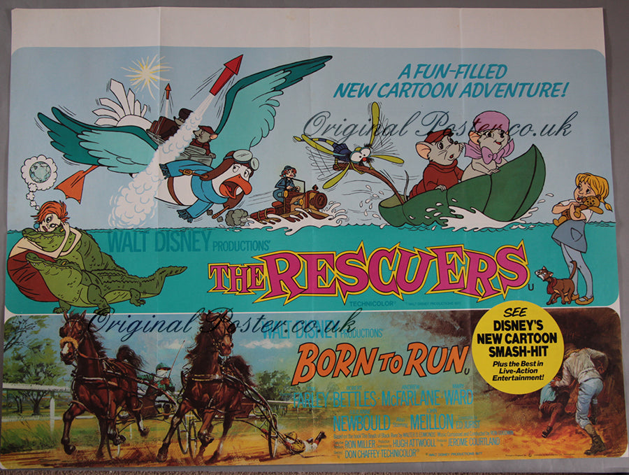 This British quad Disney double-bill is a great example of how the cinemas nearly always showed a main film and a support film for the price of one ticket. The sticker on this one confirms that "The Rescuers" was the "New Cartoon Smash-Hit. Plus the Best in Live Action Entertainment." Those were the days when a trip to the cinema involved an Intermission and hours of entertainment.
