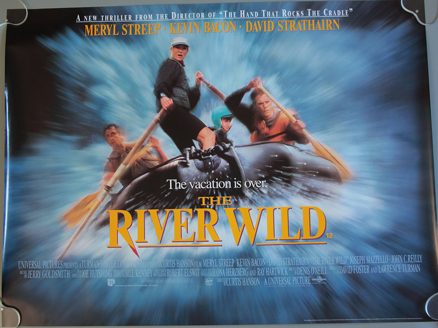 This 1994 double-sided rolled film poster pictures Meryl Streep and family white water rafting. Kevin Bacon and John C. Reilly are armed robbers commandeering the raft with the proceeds of a robbery. The poster was printed in limited numbers for use in the cinema lightbox.