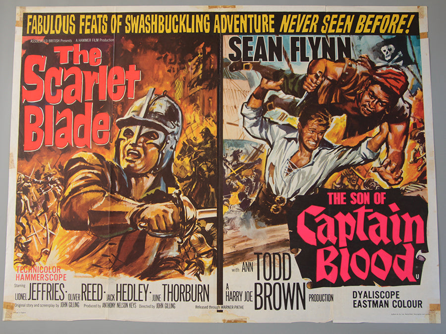 Hammer films British quad film poster from the year 1963 for the film "The Scarlet Blade" filmed in Technicolor Hammerscope and shown as a double-bill with "The Son of Captain Blood". Hammer Film Productions featured a sword fighting epic set in the English civil war with Oliver Reed starring as the swordsman and June Thorburn having Royalist sympathies. Sean Flynn is painted as a heroic swashbuckler in the support film "The Son of Captain Blood" - a pirate swashbuckler with Ann Todd in support. Printed by Stafford & co. of Netherfield, Nottingham and London., This one has very bright colours with historic tape marks.