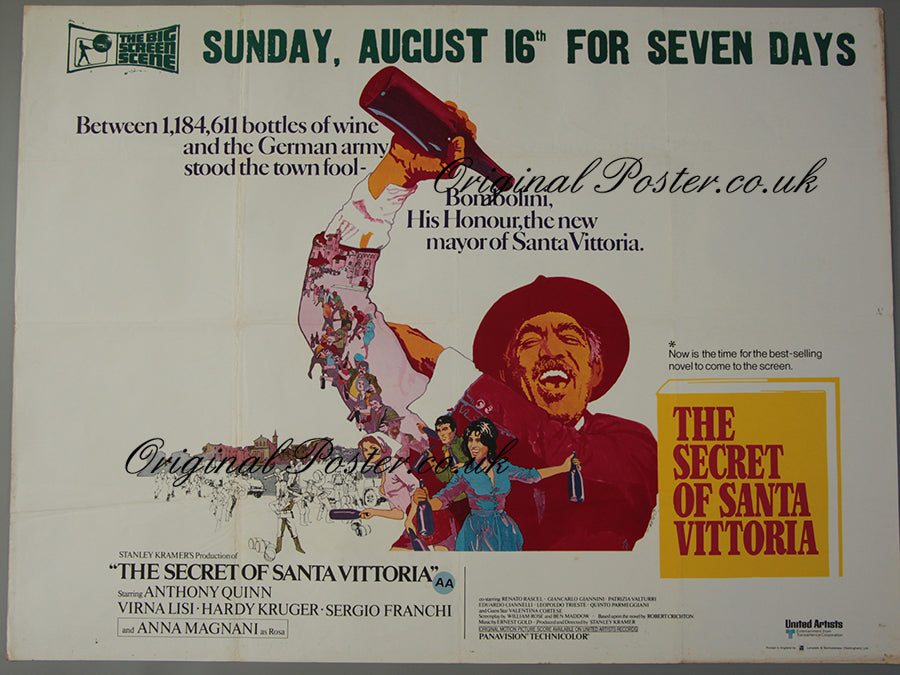 A wine lover's poster this one as the villagers hide their special wine from the Nazi's headed by Hardy Kruger. Based on a true story! Highly detailed full colour film poster with village style boozy artwork and German World War II officers, tanks and lorries painted by Bob Peak whose printed signature appears on the film poster.
