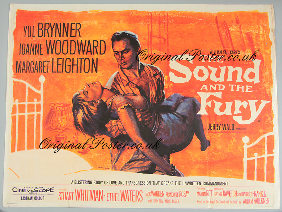 The printed signature of the artist "Chantrell" is to be found on this first release 20th Century Fox CinemaScope British quad film poster from 1959. This Great British artist captures the look of the young Joanne Woodward perfectly in the arms of a young Yul Brynner complete with hair. The film poster has a very Southern look and the colours are a nod to the companion film also a William Faulkner adaption with the same director and screen writers and leading lady - "The Long, Hot Summer". Printed by Stafford & Co. of Netherfield, Nottingham & London we have very bright colours on the film poster for what was a black and white film with just a tiny circular hole at the top right and a closed tear at the top right border edge as seen.