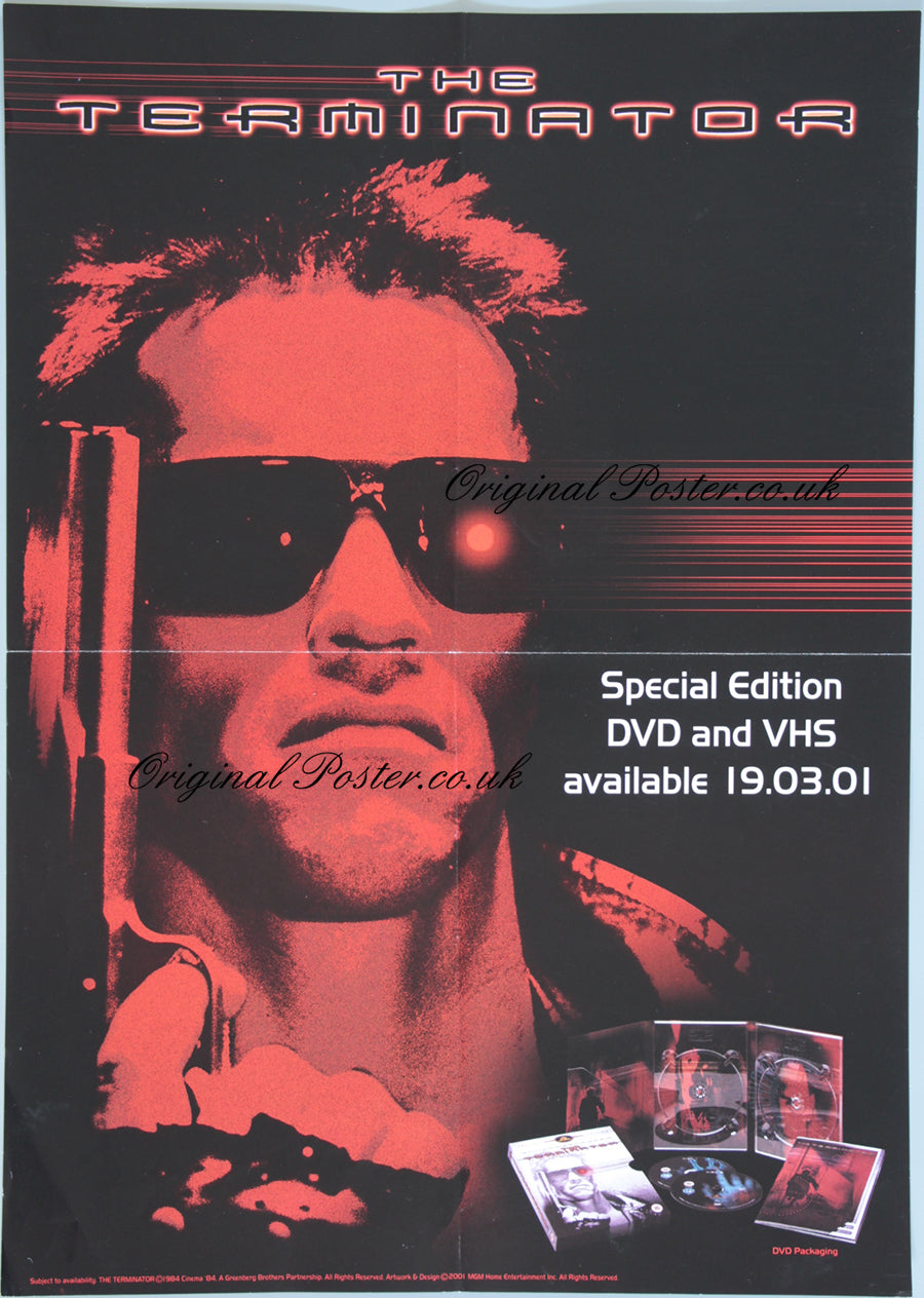 Arnold Schwarzenegger is pictured here as "The Terminator" whose famous line is "I'll Be Back." Here he is 17 years later with the DVD! This promotional film poster is in great folded condition with no pinholes and even pictures the special edition DVD packaging to prove it.