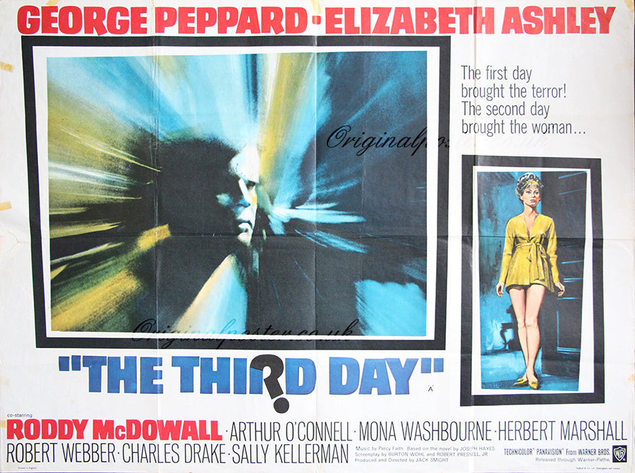 This 1965 artwork from Chantrell displays one of his more unusual styles in portrayal of George Peppard in psychodramatic format well suited to the character in this amnesia thriller. Peppard's wife, Elizabeth Ashley, is portrayed in the more familiar style reminiscent of previous works including "She", two years previous and typical also of "One Million Years BC" the year following this film in 1966. Tiny archivally repaired fold corner to left-middle fold ( larger than a pin-head but hardly visible)