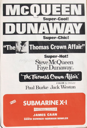 Super cool sixties film double crown film poster in rolled condition with Steve McQueen and Faye Dunaway kissing in "The Thomas Crown Affair." This is a classy smaller sized film poster produced for the British cinema which was also showing "Submarine X-1" in the same year 1968. Double-crown film posters were half the size of the British quad and were produced in smaller quantities. The main feature received prominence and the stark black and white image here highlights the classy matter of fact relationship between Steve McQueen and Faye Dunaway with the "Super-Hot!" picture of them kissing together with the tagline add a human factor warmth. A difficult poster to find. Creasing in areas of the film poster and a few pinholes in the corners.
