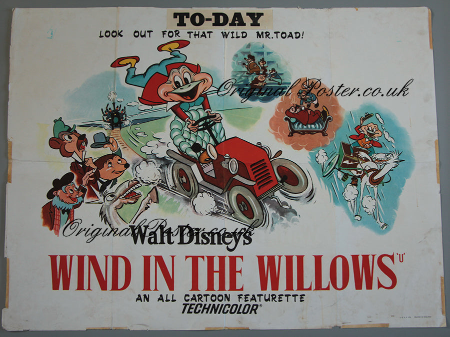 This British quad film poster with printing by S. & D. S. Ltd. of England is a great find. It is not often that we come across a full British quad for a Disney cartoon featurette as by nature it is shorter and thus chosen as a support and lucky to feature on a double-bill. The highly detailed artwork is captivating as the wild Mr. Toad hangs on to the steering wheel whilst suffering not one but two punctures in his car tyres whilst being hotly pursued by the police. We love the horse who appears twice to great effect an amazing find and one that few Disney collectors will possess. This rare survivor has historic tape marks in the borders as seen, some grubby marks and a cinema manager sticker "To-Day" at the top centre. The film poster was purchased from the Lynton cinema in Devon.