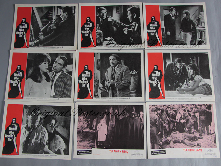 Two of these cinema lobby cards are for "The Return of Dr Mabuse" which appear to be from the 1966 re-release as "The Phantom Fiend", these appear to be the original 1961 cards as you can see the title of the original film thru the sticker title placed on top. Gert Frobe can be seen gun in hand confronting the phantom. The other cards are from the 1965 film "The Woman who wouldn't die" and are individually numbered and from Warner Brothers. (9 cards)