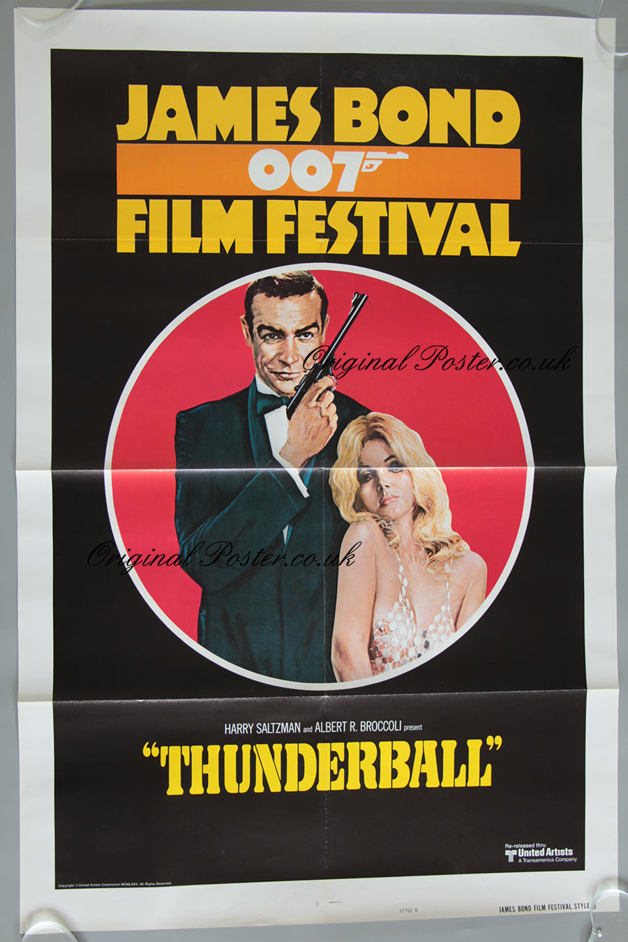 This 1975 film poster is for the James Bond film "Thunderball" and pictures a fine painting of Sean Connery in the 007 role by French artist Yves Thos. Pictured alongside him is we believe Luciana Paluzzi who the artist has daringly painted wearing a very revealing metallic dress. The film poster was clearly designed to catch the eye and is in folded condition as supplied to the cinema, litho printed style B with no pinholes.