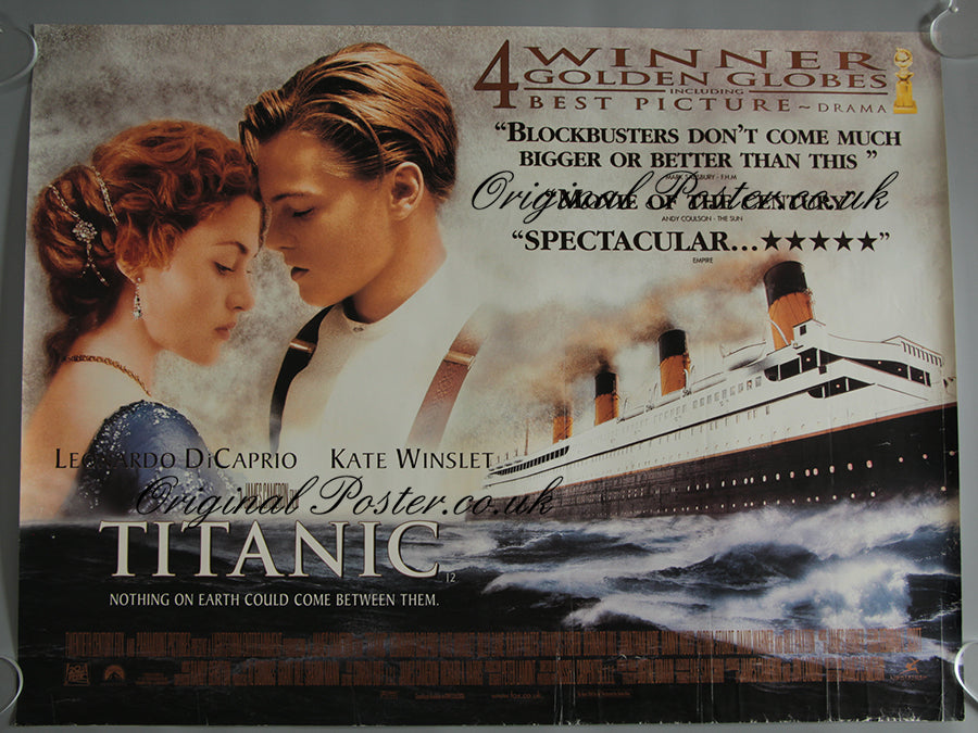 Rolled double-sided British Quad film poster from 1997 was printed in limited quantities for use in the light boxes at British cinemas. It features a picture of the White Star Liner "Titanic" together with a touching portrait of Leonardo DiCaprio and Kate Winslet. This 1997 film poster is cinema used and has vertical crease marks as seen on the photo. There is some small edge wear at the bottom right corner as seen.