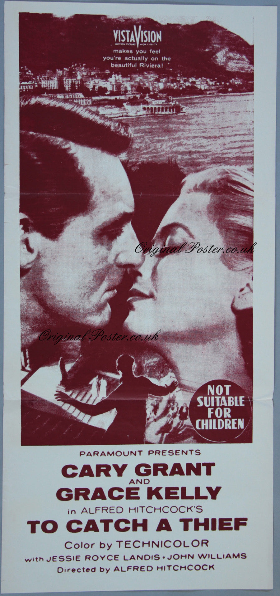 Alfred Hitchcock's "To Catch a Thief" 1950's re-release Australian day-bill film poster picturing the stars Grace Kelly and Cary Grant in the beautiful French Riviera. Fold marks and a few tears in the borders but no pinholes.