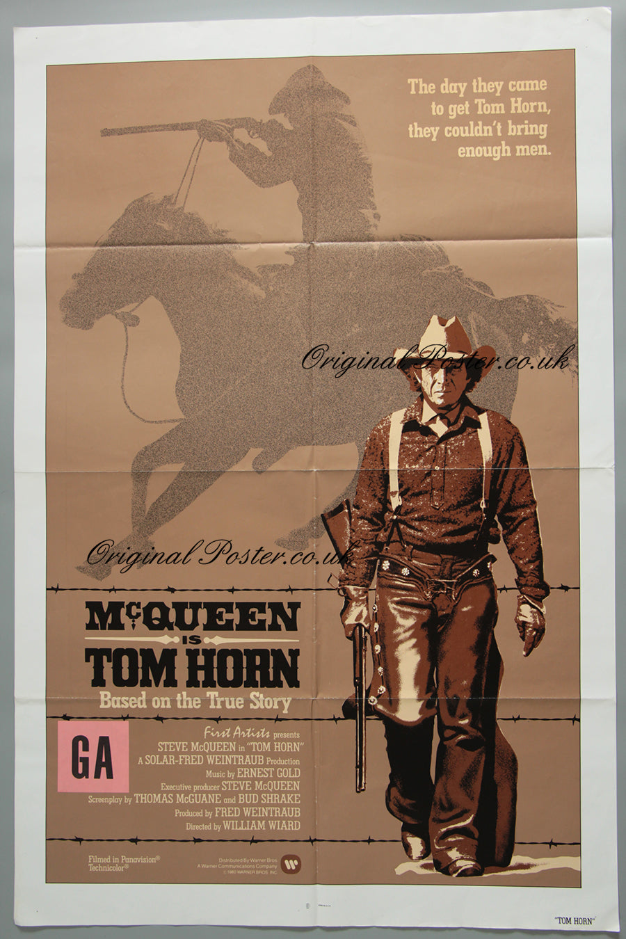 The US One-sheet features in the background Steve McQueen on horse-back in addition to the artwork featured on the British quad. John Alonzo was responsible for the photography of the stunning landscapes while Steve McQueen sets the scene perfectly for this grim, realistic true story western. McQueen is the cavalry scout who turns bounty hunter for a rancher to put a stop to local rustling. Litho printed in the USA this is a rare style poster as it features McQueen on horseback in silhouette. Acquired directly by us from a cinema in New Zealand and sporting a GA censor certificate at the lower left. Folded condition with no pinholes.