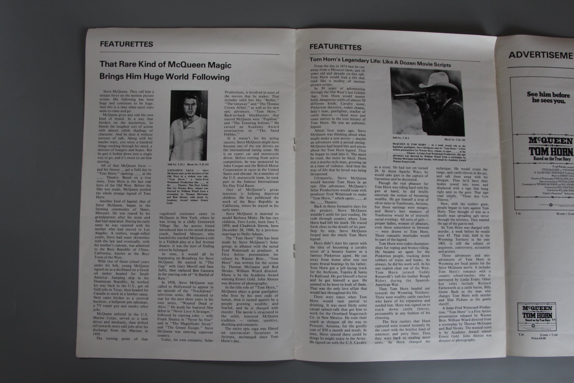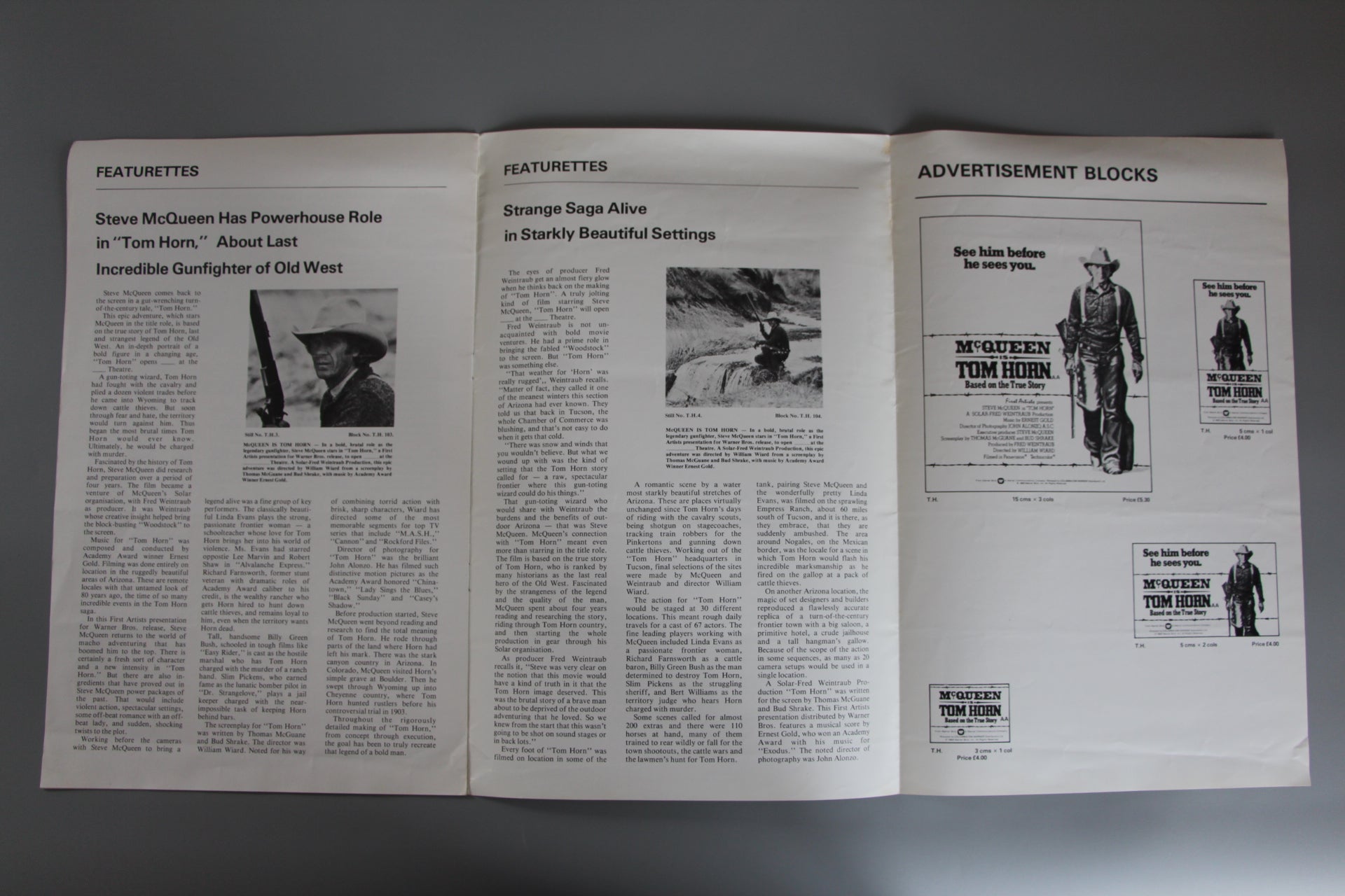 Steve McQueen exhibitors campaign book as issued to the cinema owner for promotion of the film "Tom Horn". The book features great photos of Steve McQueen complete with featurettes detailing the making of the film where Steve McQueen stars in a powerful role based on a true story about the last incredible gun fighter of the old West. The book includes Ad blocks with prices and some great photos from the film.