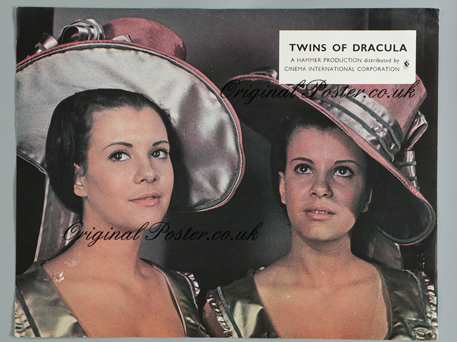 This front of house cinema lobby card from 1971 is for the Hammer film known as "Twins of Dracula" or "Twins of Evil". Pictured are Playboy magazines first twin centrefolds Mary and Madeleine Collinson in this Hammer film offering gothic atmosphere, lesbianism and period vampire horror. The card has no pinholes but does have a slight piece of paper lift at the lower left as seen.