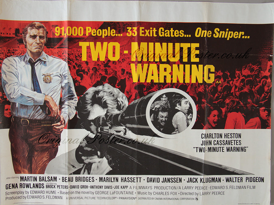 This 1976 film poster has a fantastic portrait of Charlton Heston in the role of Peter Holly who pursues a lone sniper at the NFL play off. Superb colour painting of Charlton Heston on this British Quad printed by W. E. Berry. A closed tear of 3 inches and 1 inch on the right horizontal border which we have repaired with archival tape.